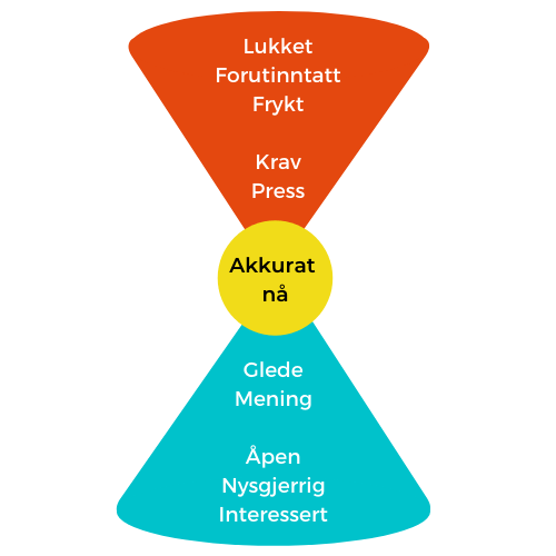 I midten ser du senteret, punktet der du kan nullstille og restarte deg selv. Det røde området står for beskyttelse og kontroll, det som trigges av frykt, krav, press og stress. Det turkise området står for glede, nysgjerrighet, lek og interesse.